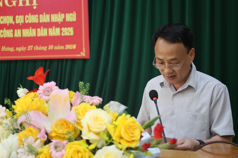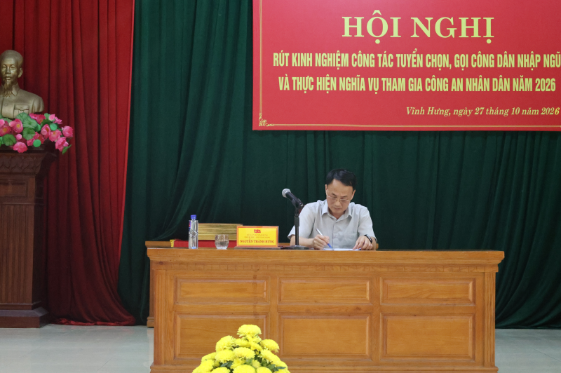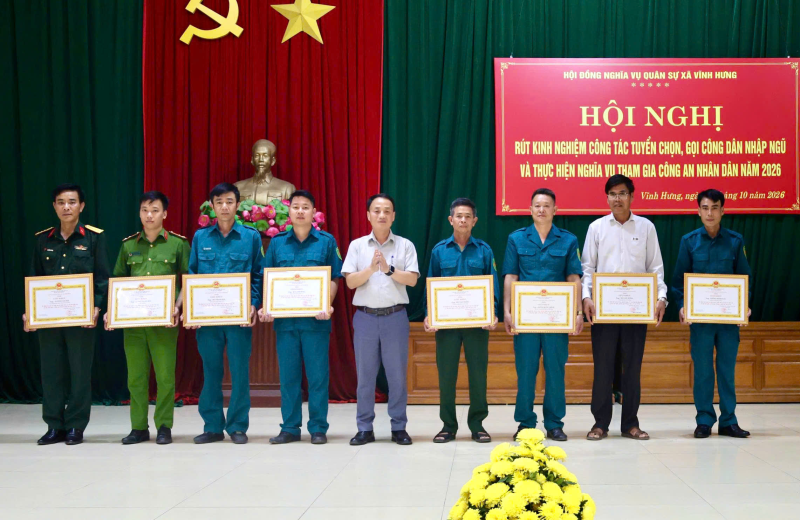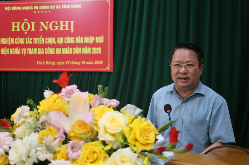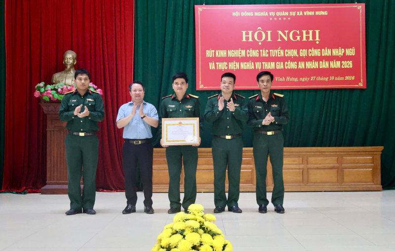 Ngày 28/3/2026, tại Hội trường Quân sự xã Vĩnh Hưng, Hội đồng Nghĩa vụ quân sự xã tổ chức Hội nghị rút kinh nghiệm công tác tuyển chọn, gọi công dân nhập ngũ và thực hiện nghĩa vụ tham gia Công an nhân dân năm 2026.